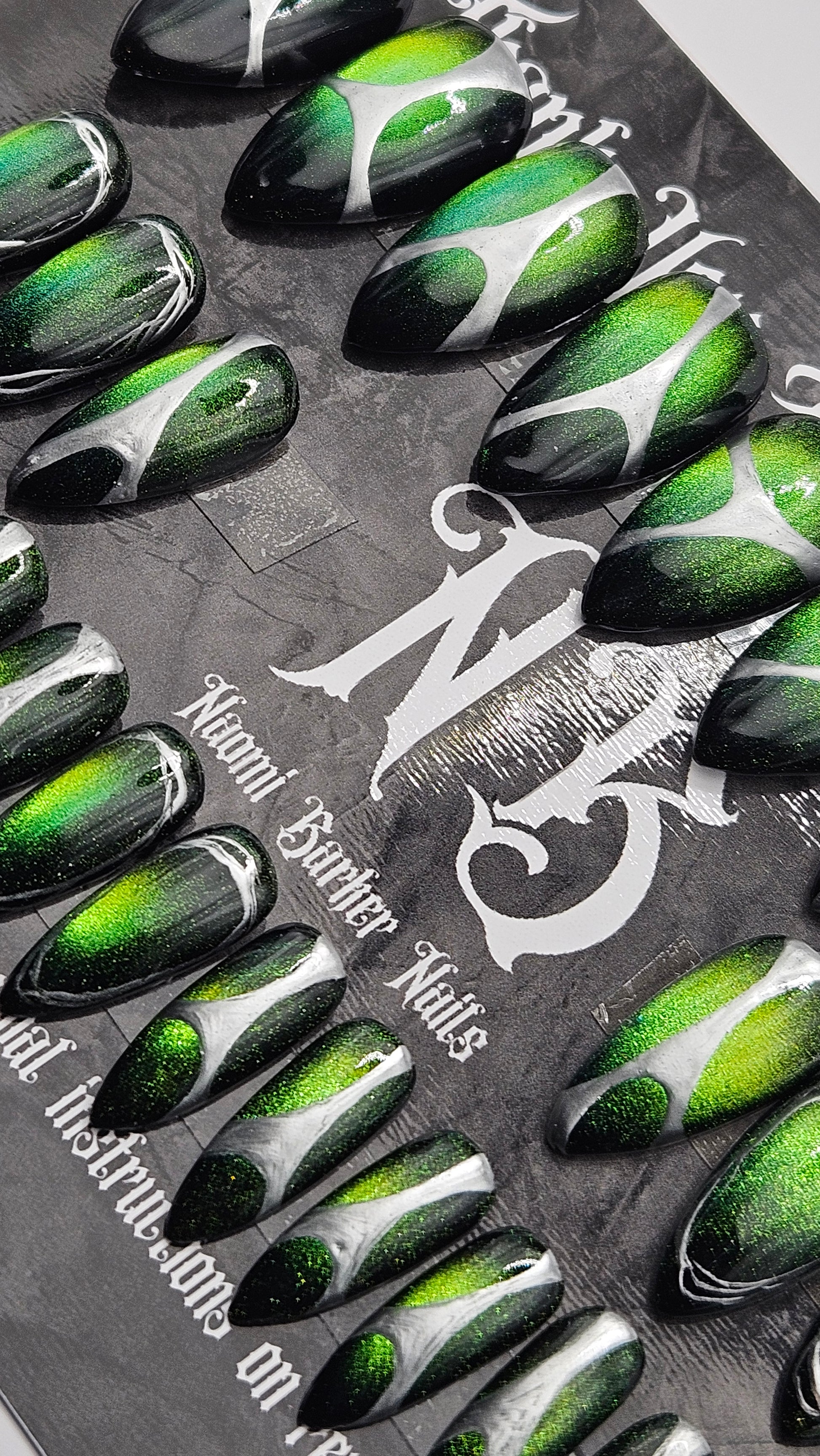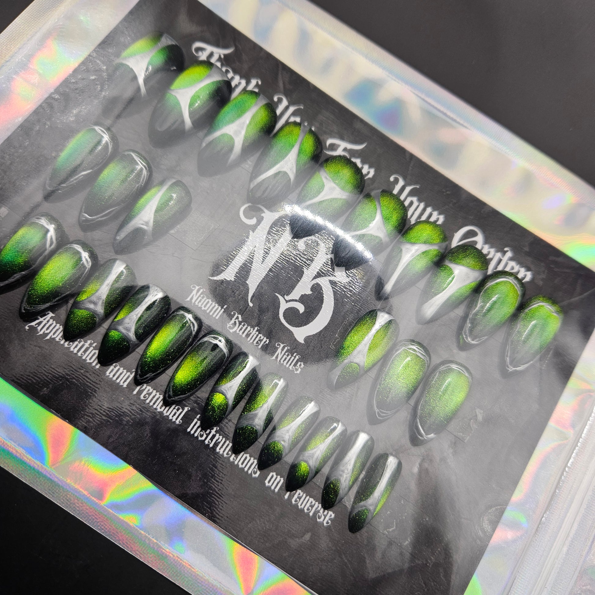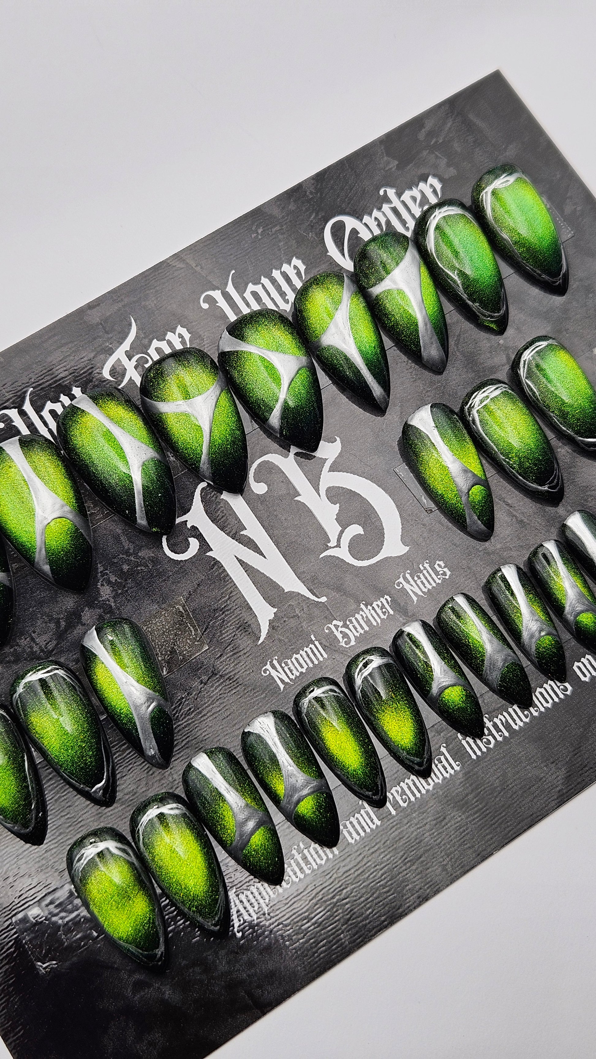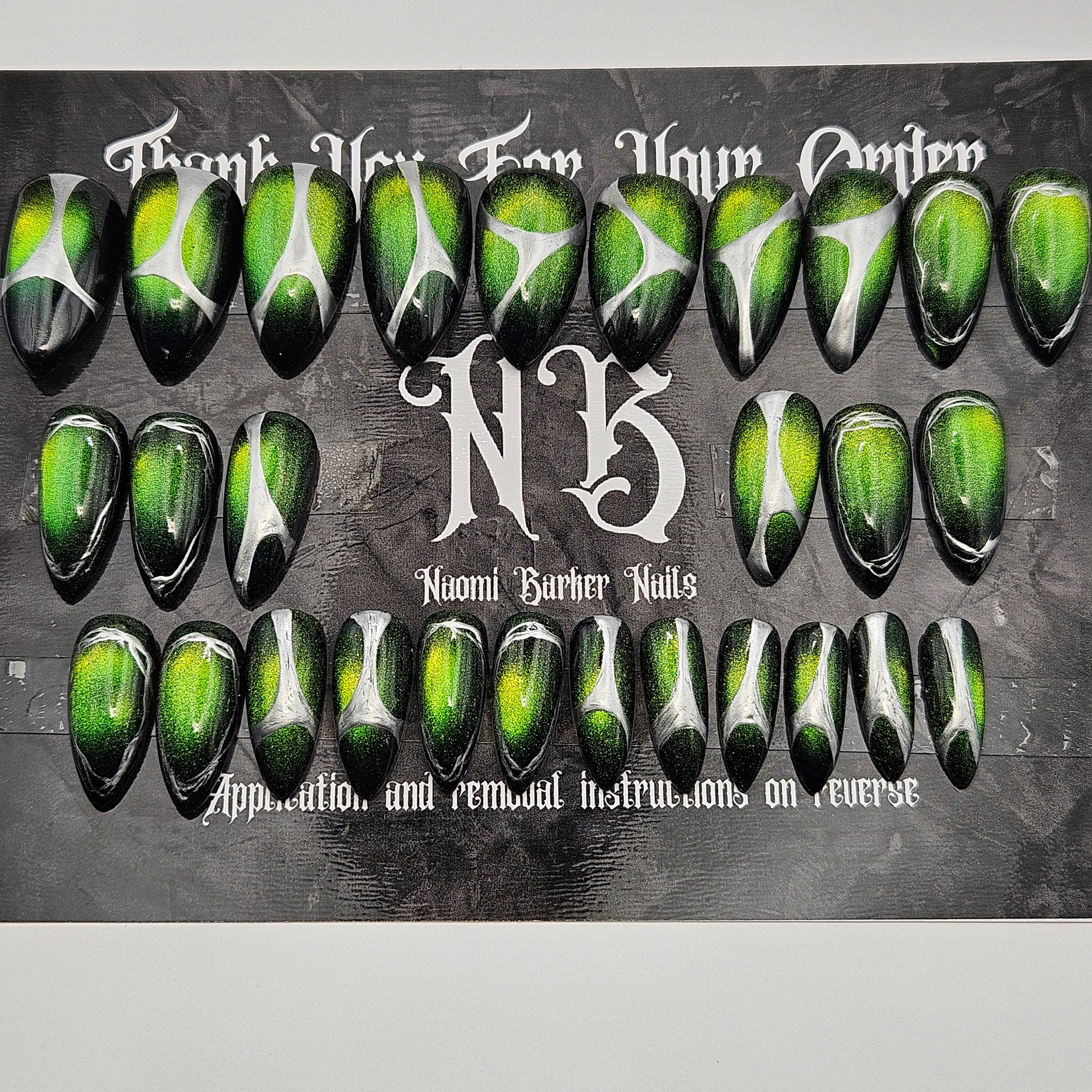 ✨️ These nails are insane! They feature a stunning green cat eye over a black base with silver details on each nail. The green cat eye catches beautifully in the different lights
