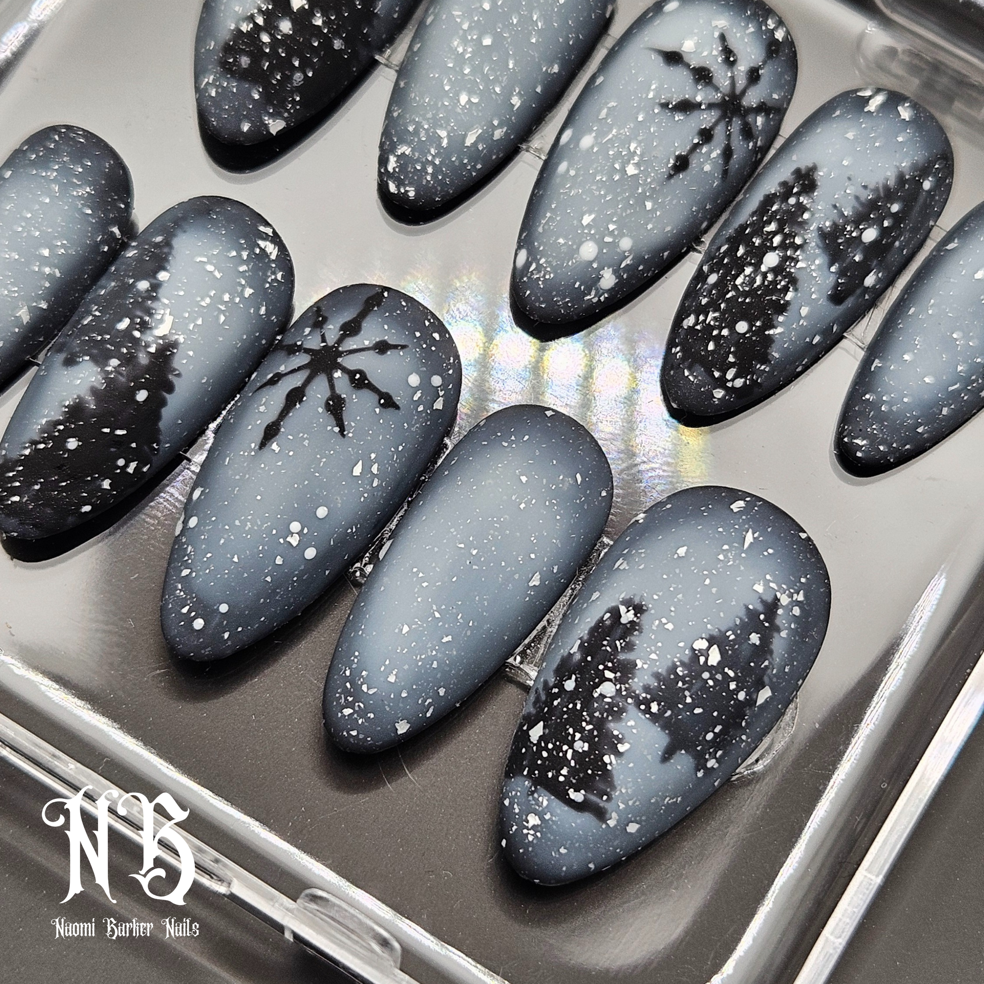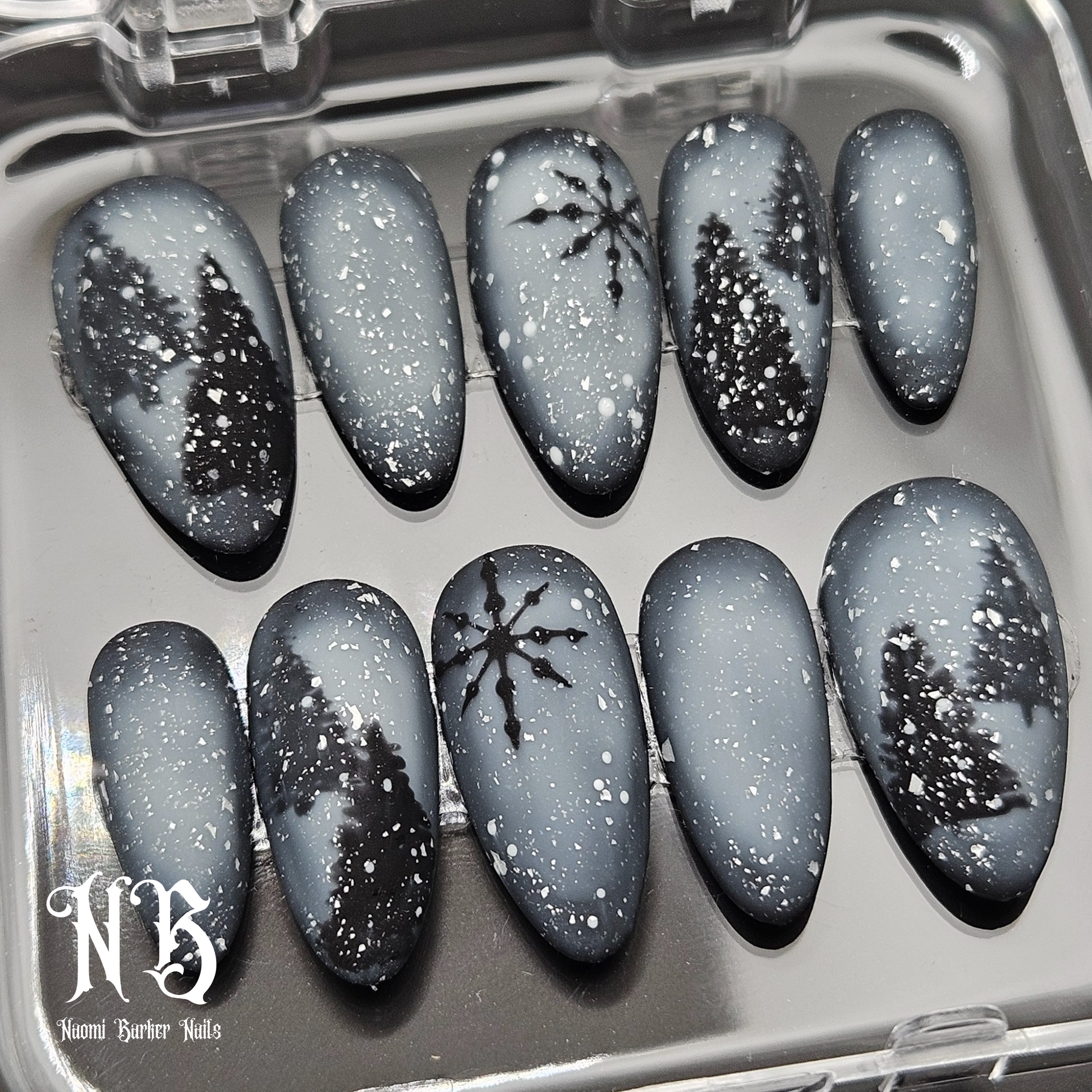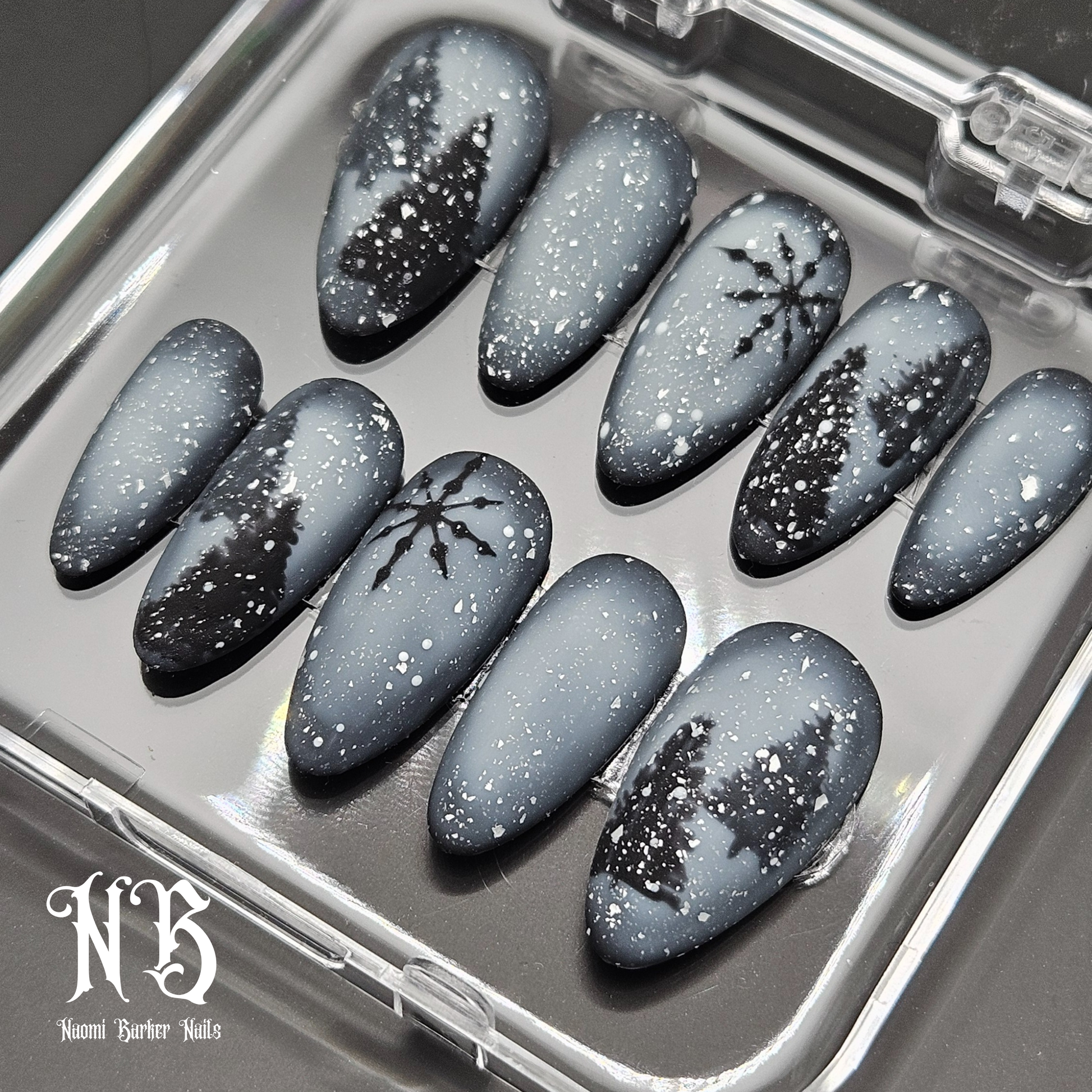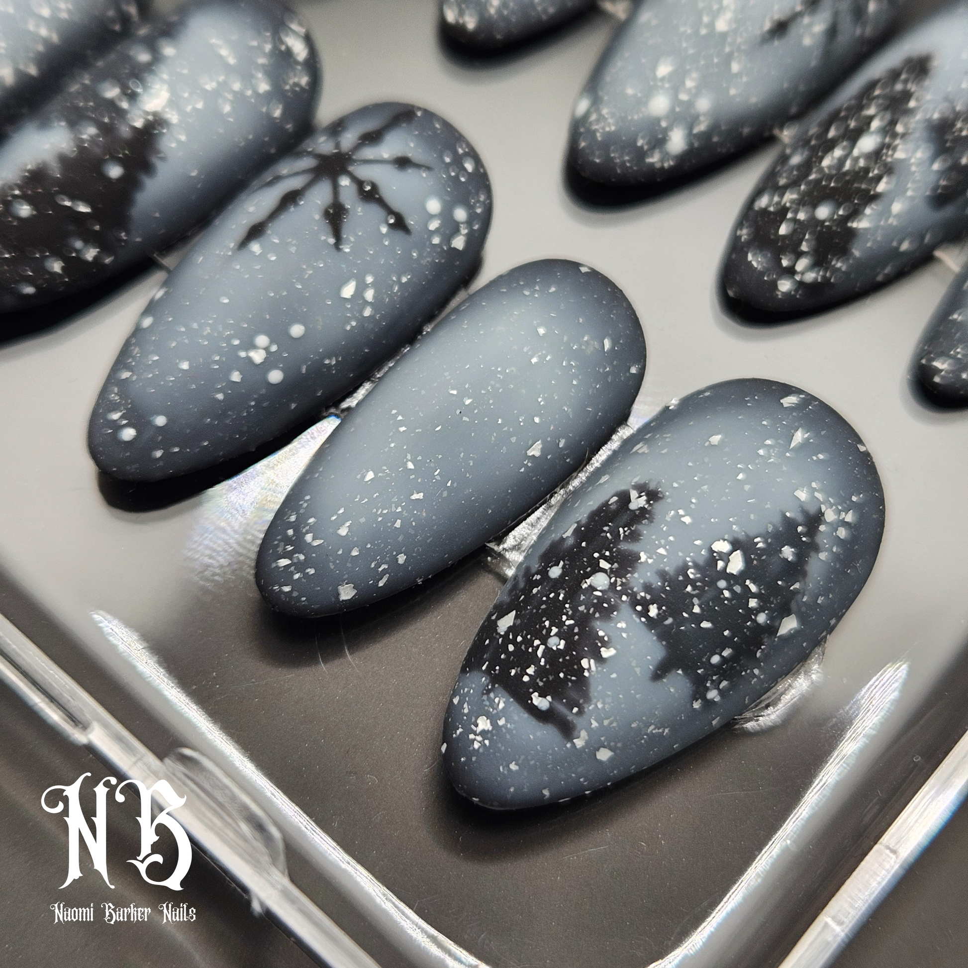 This moody winter set is gorgeous. Trees show through the misty snowstorm in the dark of night. An enchanting alternative to the usual colourful Xmas nails.