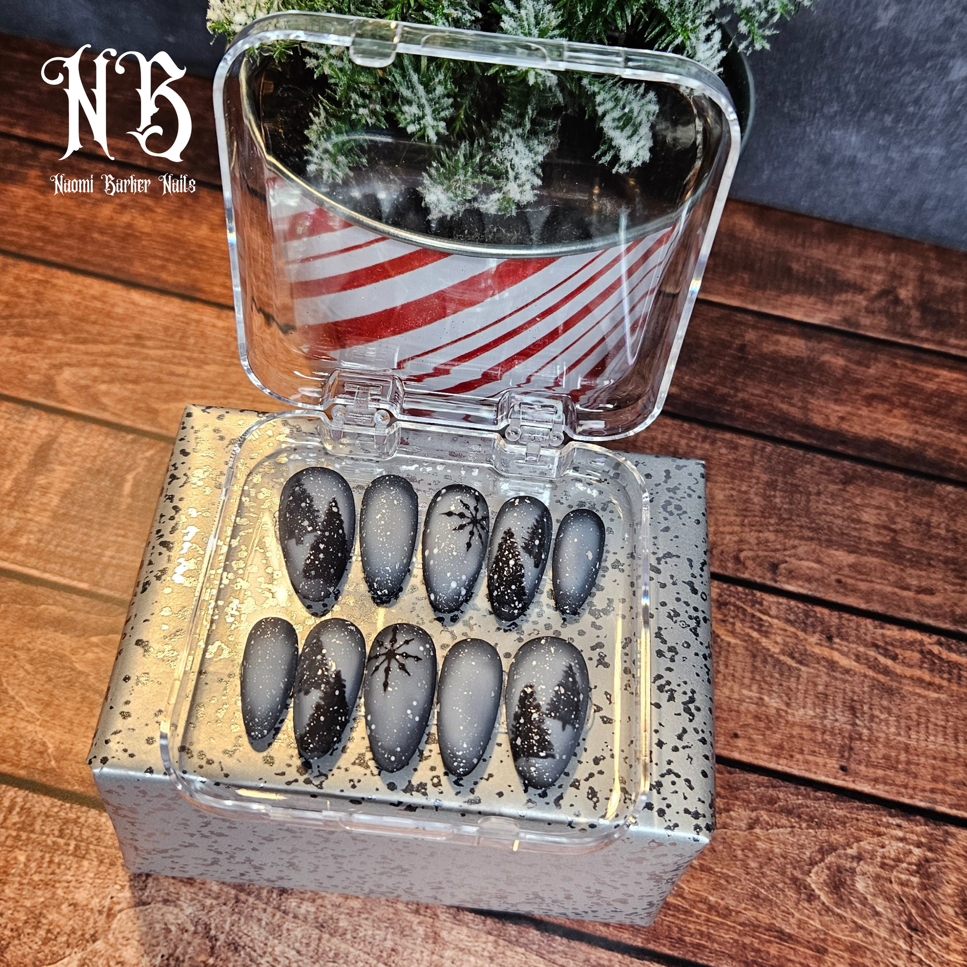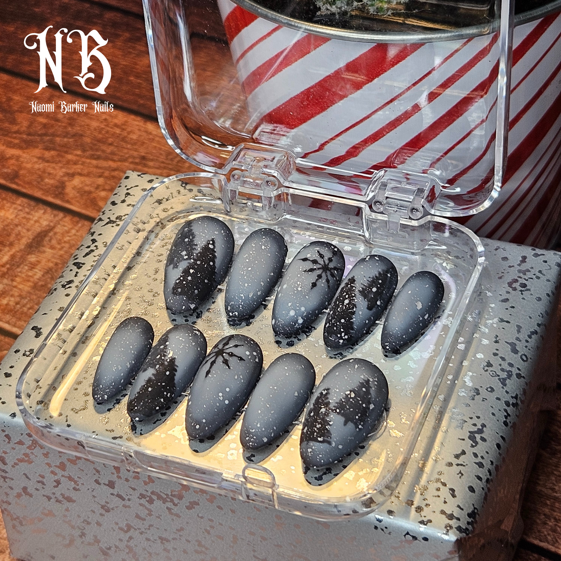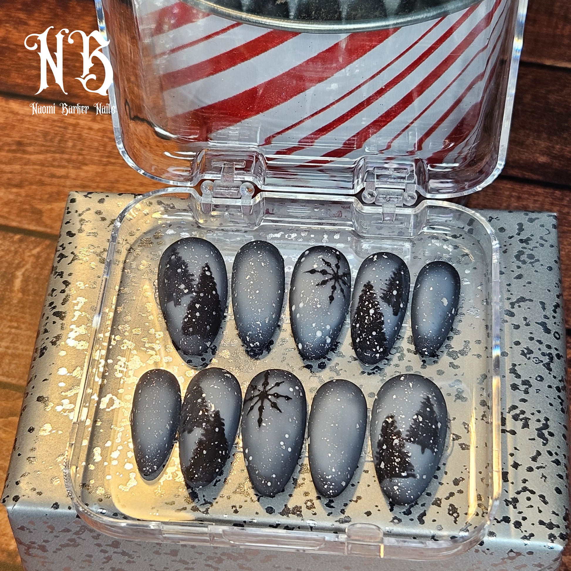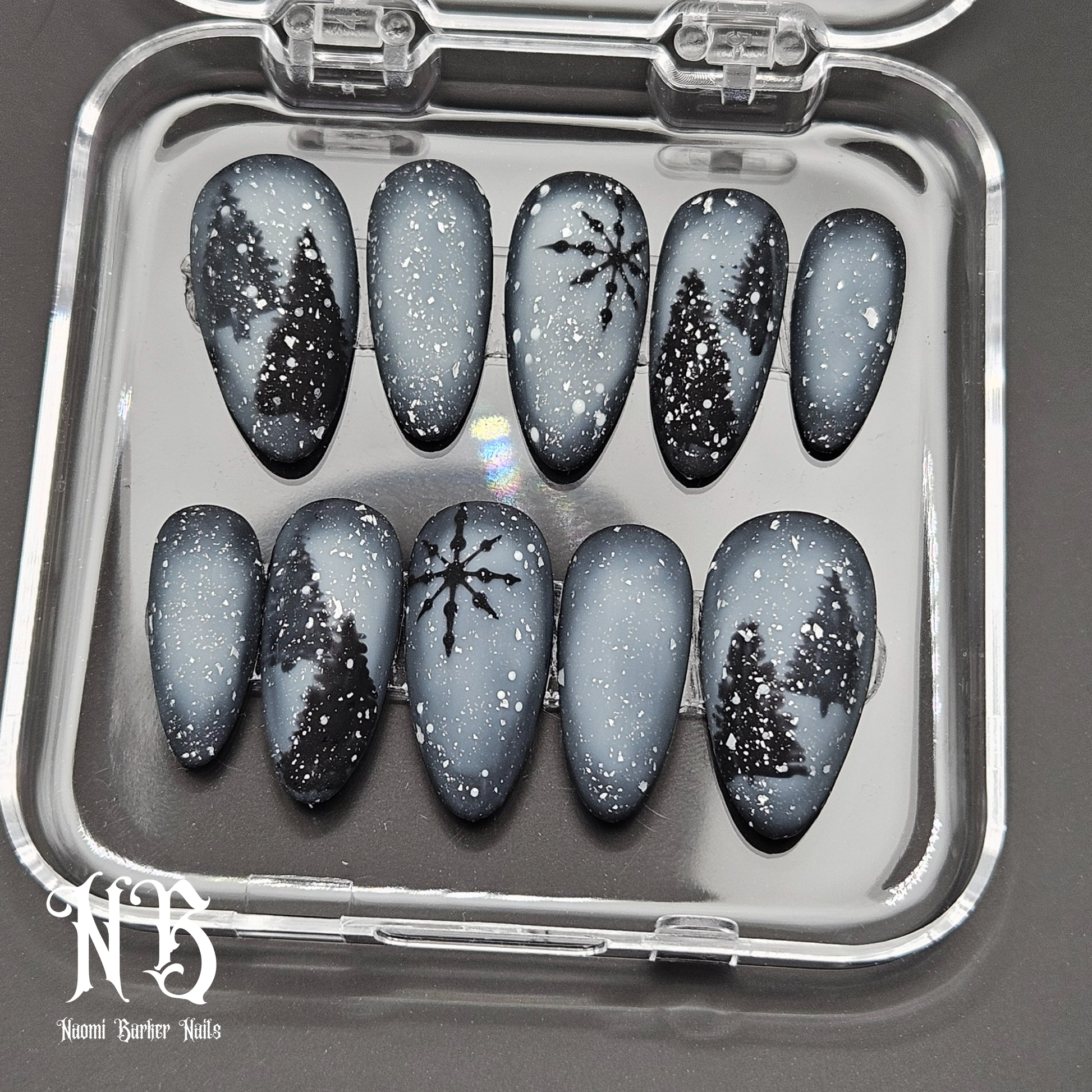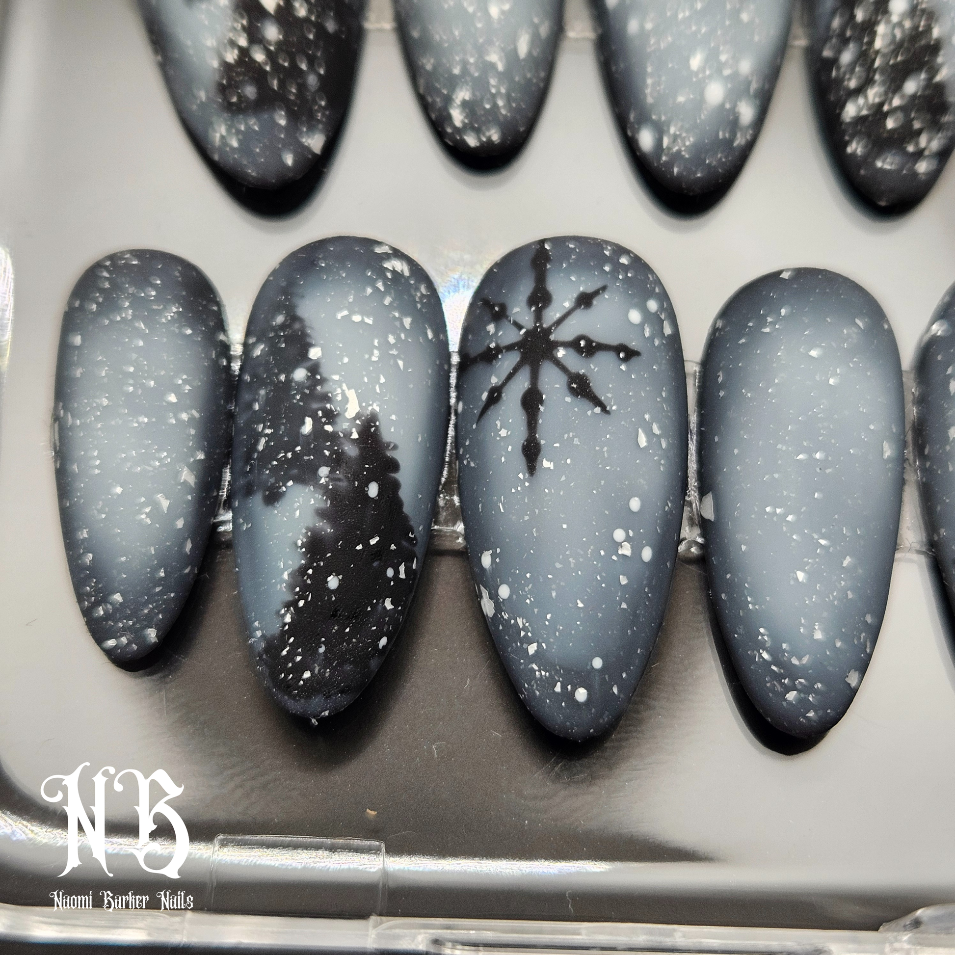 This moody winter set is gorgeous. Trees show through the misty snowstorm in the dark of night. An enchanting alternative to the usual colourful Xmas nails.