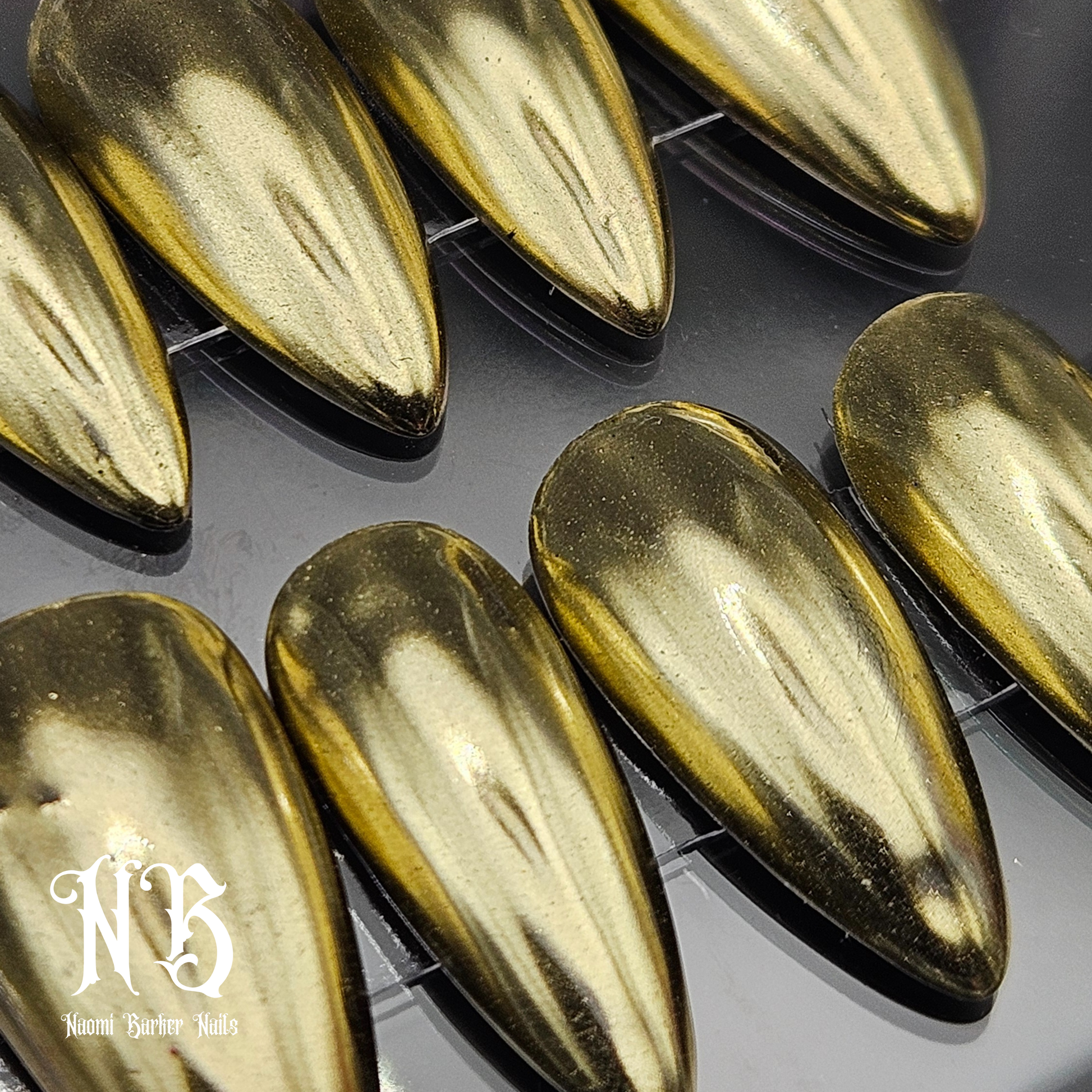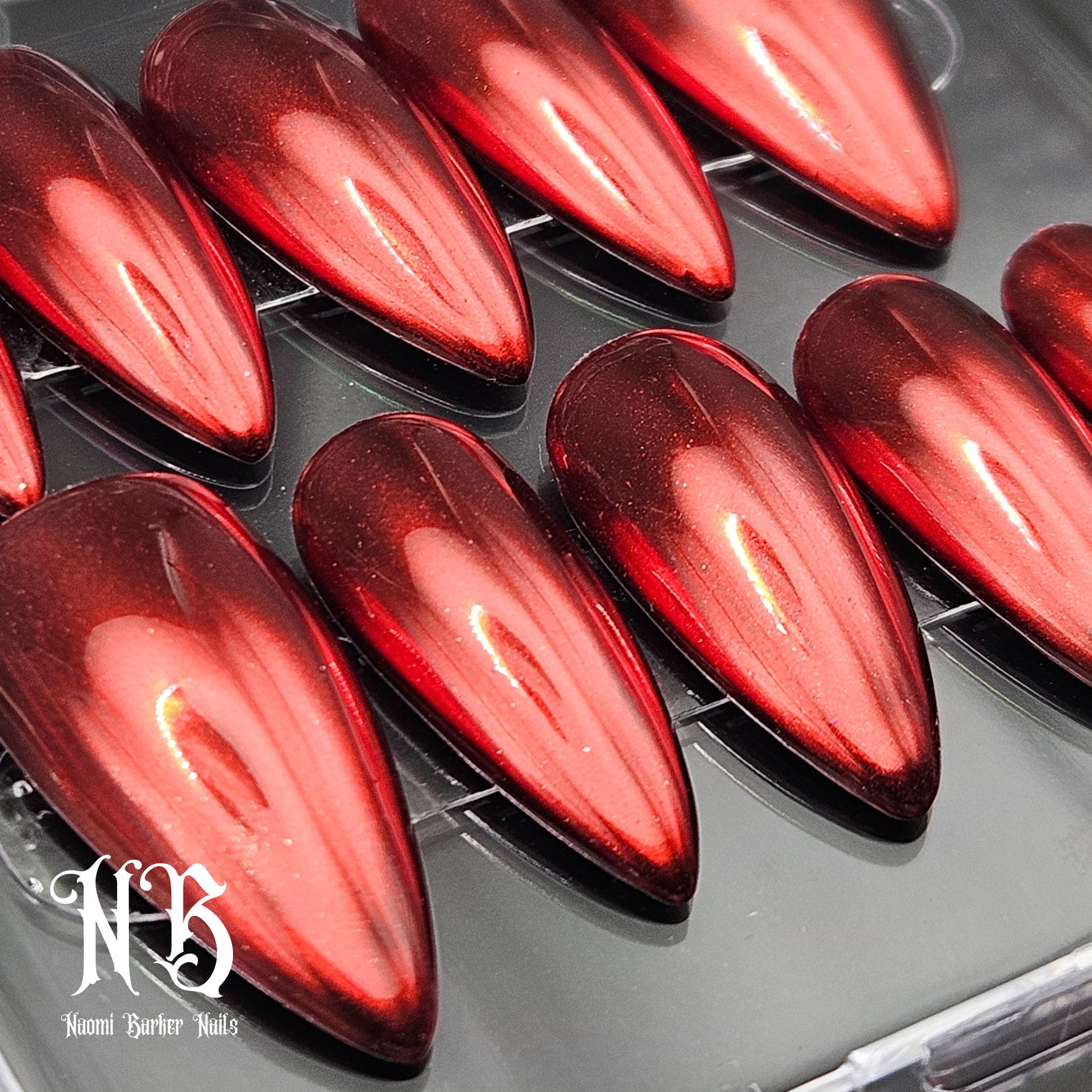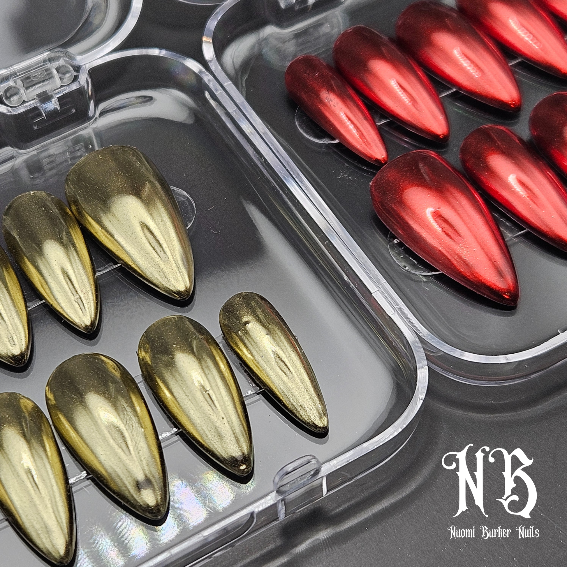 Full chrome nails. Pictures show red and gold versions but other colours available. Purple, pink, blue, green, silver, holographic silver etc