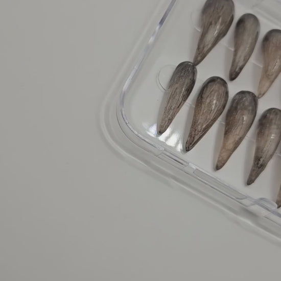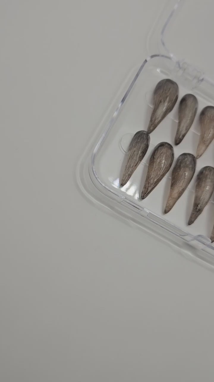 These nails are made using stiletto tips to build from. Stiletto tips in the length of your choice will be sent out for sizing. Please note the shorter the nail length, the stubbier/wider the claw. Xl Claws will be very long and slim.